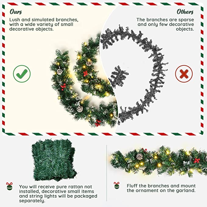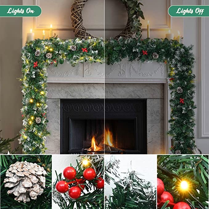 2.7M Christmas Garland With Lights 9FT Artificial Wreath Garland Green Artificial Xmas Garlands with Pine Cones Red Berries Outdoor Decorations Prelit Garland For Fireplace Stairs